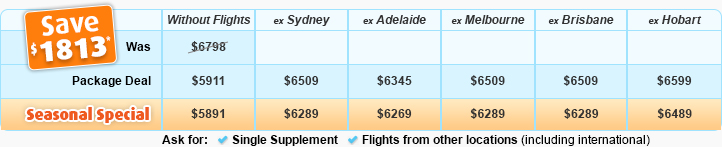 *Starting holiday costs per person, two share, for low seasons (A$). Seasonal surcharges apply outside of low season. As prices vary based on travel dates, be flexible with dates to get the best deals! Itinerary and vehicle types subject to change without notice. Subject to limited availability at these prices, after which higher prices apply, book now. Some governments and service operators have Covid vaccination requirements. Your included flights advised via email with 24 hours to select alternative flights, routing or airline (alternatives may be at a higher price). Included flights may not be the most direct routing. Arrive earlier/stay longer for specified airports only. Stop-overs are not possible. Subject to Booking Conditions, see Important Information before booking. © DISCOVER AUSTRALIA Booking Code: mp332